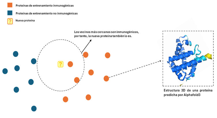 Se trata de modelos de aprendizaje automático, modelos matemáticos que aprenden a reconocer patrones en grandes cantidades de datos. Un ejemplo clásico es el algoritmo del “vecino más cercano” (K-nearest neighbors o K-NN), uno de los primeros modelos de IA. Es uno de los muchos que utilizamos para responder a las anteriores preguntas para decidir si una proteína produce anticuerpos.
