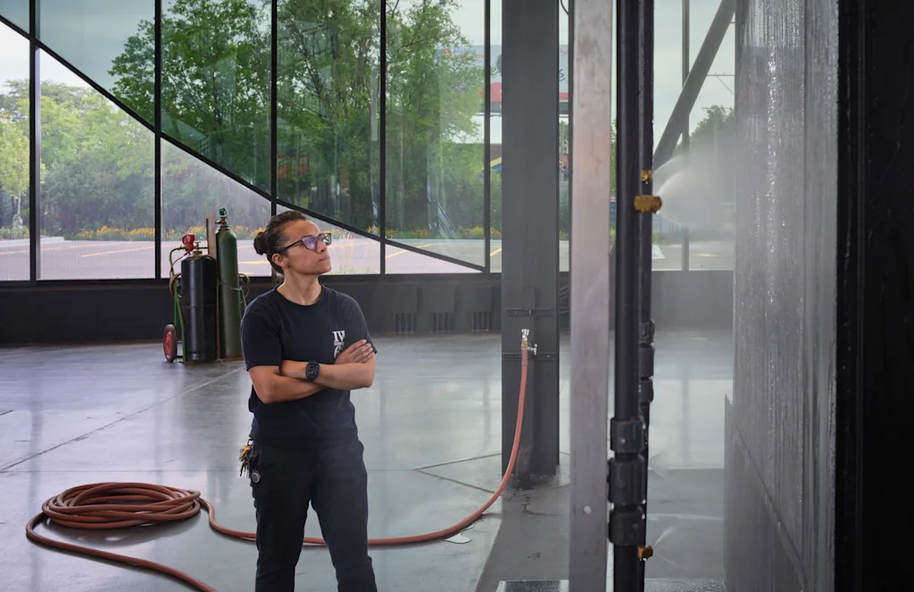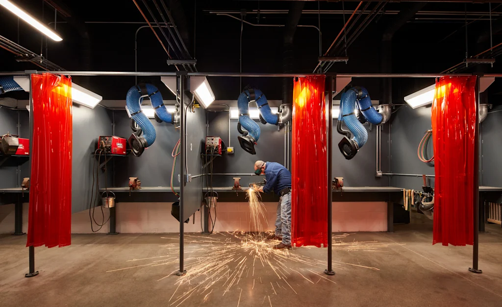 El exterior también refleja las habilidades del oficio. La forma de la fachada de vidrio, con su ligera curvatura cóncava, se inspiró en un cordón de soldadura y busca evocar el lado elegante de lo que los herreros pueden hacer.