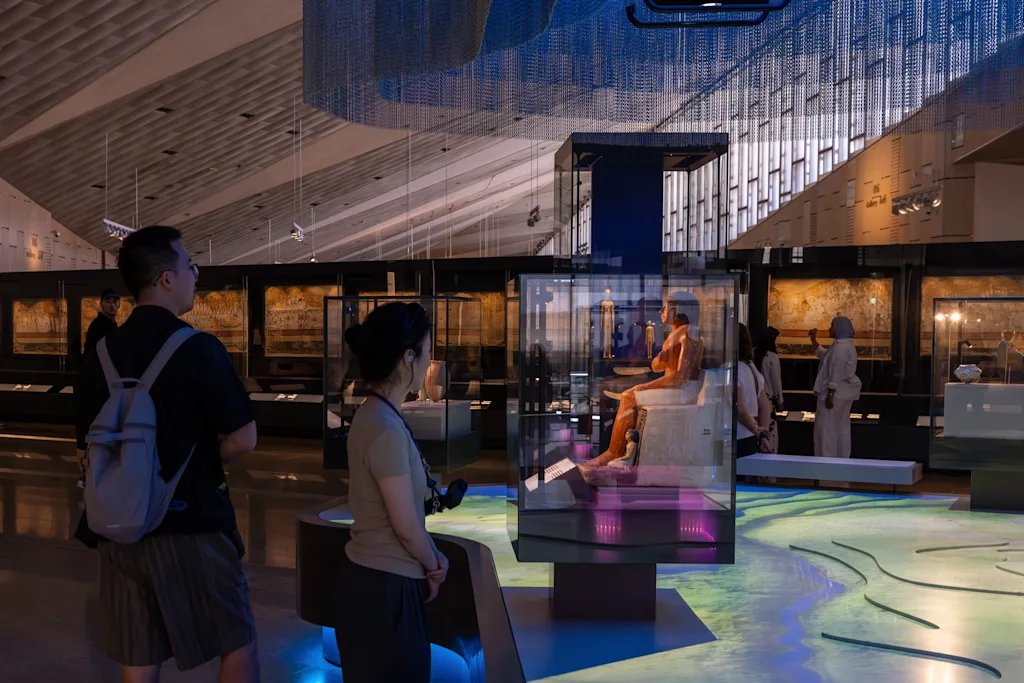 Lo primero que ven los visitantes al entrar al museo es una larga escalinata flanqueada por miles de artefactos, sarcófagos y estatuas que recorren los 4,000 años de historia faraónica de Egipto. Es un recorrido intensivo para los visitantes, en su mayoría internacionales, antes de llegar a la planta superior, donde se exploran con mayor profundidad secciones más específicas de la historia del antiguo Egipto. Sus galerías principales abarcan temas como reyes y reinas, sistemas de creencias religiosas y la sociedad del antiguo Egipto, y el museo cuenta con una extensa colección de artefactos de la tumba del rey Tutankamón. La distribución del museo permite que cada una de estas galerías funcione de forma independiente, pero con conexiones visuales entre sí para integrarlas en un arco histórico más amplio.