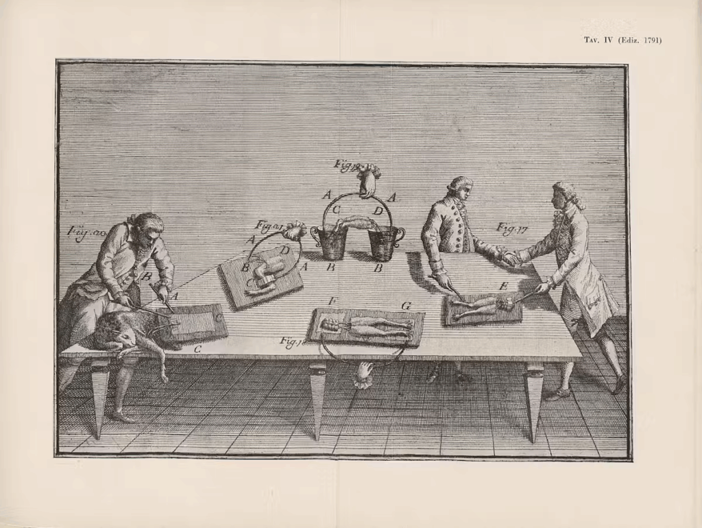 Supongamos que las partes se colocan en su lugar. ¿Podría la electricidad reanimar el cuerpo? Las ranas con espasmos de Galvani engañaron a muchos haciéndoles creer que sí. La electricidad estimula las membranas nerviosas, lo que provoca que las células existentes se activen; una simulación fugaz de la vida, no su restauración.
