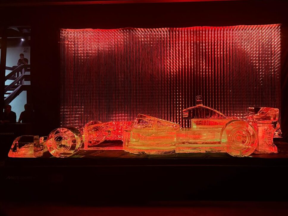 El recibimiento también era impactante para todos los que somos fans de las carreras, porque te encontrabas con una instalación de motores de coche gigantes y la réplica de un auto de carreras tamaño real hecha en hielo, una locura visual que combinaba diseño, espectáculo y pasión por el deporte y que nos recordaba que la ingeniería, la velocidad y la cultura automovilística estaban al centro de la experiencia.
