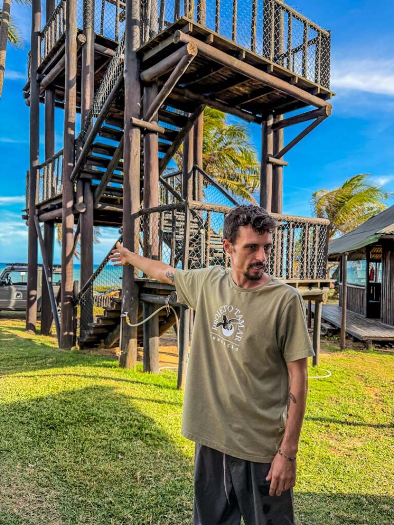 “Las tortuguitas cuando salen de los nidos van hacia la luz –dice Landis Vinícius, coordinador de campo en Projeto Tamar– y no es que pueden ir: van a ir hacia las luces. Una tortuguita tiene que llegar al mar, pero si viene para acá (hacia tierra) tiene el sol, los perros, los gatos y cualquier cosa que la va a atrapar. Los hoteles acá tienen una condición de las luces muy favorable a las tortugas”.