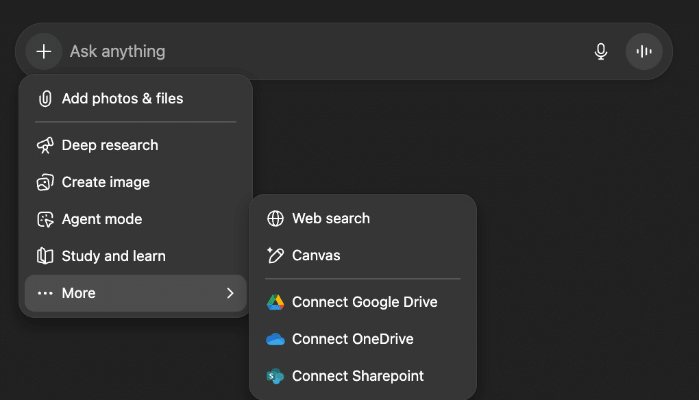 Desde el lanzamiento inicial de ChatGPT, OpenAI ha añadido numerosas funciones para mejorar la forma en que trabajamos con él. Algunas son esenciales, mientras que otras son más específicas de cada dominio. Se puede acceder a la mayoría de las funciones mediante el botón +.