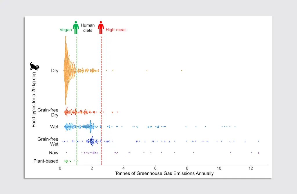 “Al alimentar a un perro de 20 kilogramos con comida cruda o húmeda, muchos de estos alimentos tienen un mayor impacto que una dieta humana rica en carne”, afirma Harvey. Los alimentos húmedos sin cereales y crudos también generan aproximadamente el doble de emisiones que una dieta vegana.
