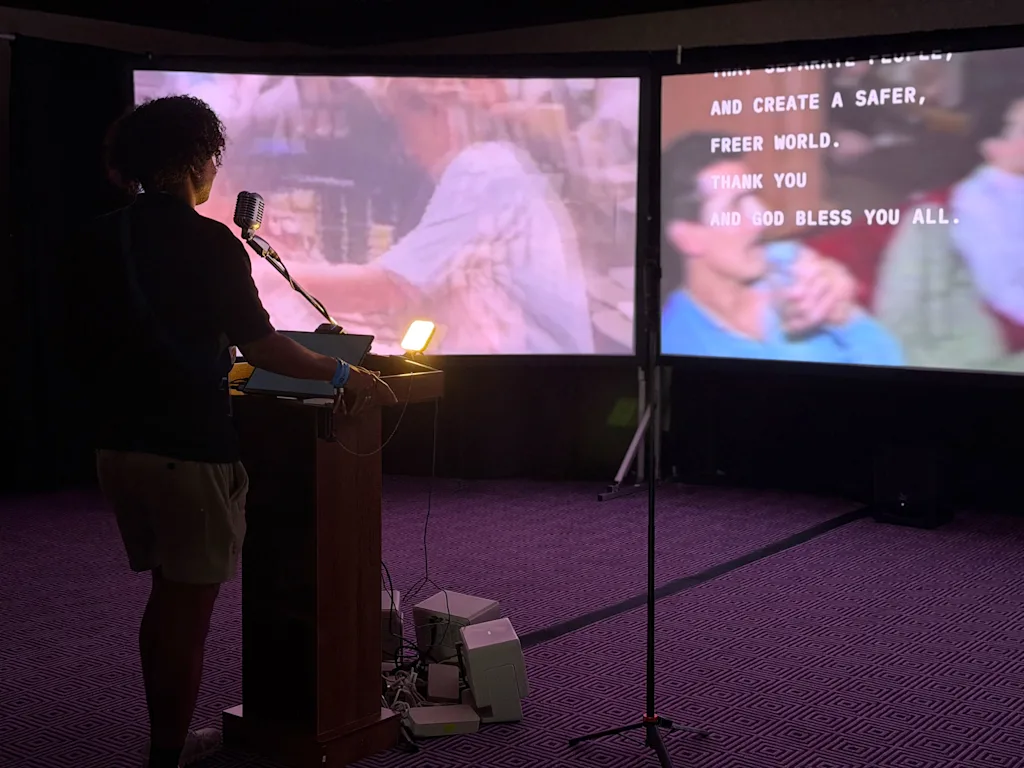 En un hotel del centro de Austin, los asistentes se acercan a un podio flanqueado por tres pantallas gigantes que proyectan imágenes de archivo. Tras dar su consentimiento para el uso de su voz e imagen, eligen uno de los tres discursos de tres épocas muy diferentes: el discurso de Malcolm X de 1964, El voto o la bala, pronunciado en Cleveland; el discurso de Ronald Reagan de 1987, Derriben este muro, pronunciado en Alemania; y el discurso de victoria de Zohran Mamdani de 2024 en Nueva York.