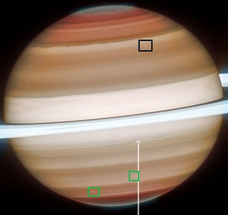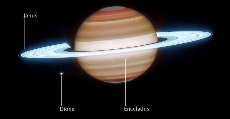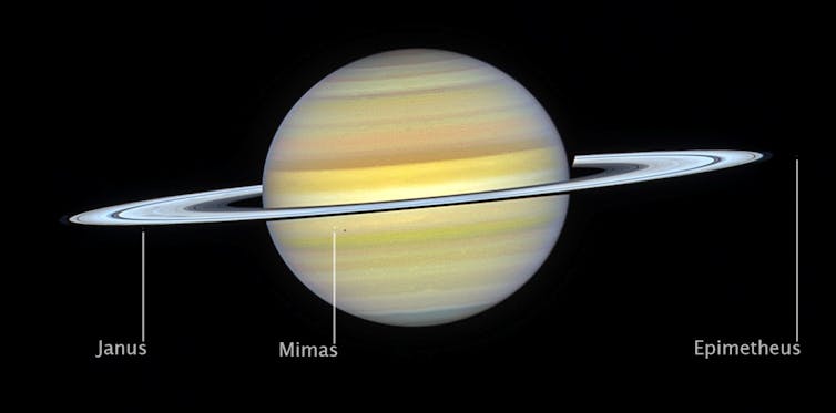 Además, un séptimo satélite está presente en la captura en el visible del Hubble: Epimeteo, el de menor tamaño de los siete y que comparte órbita con Jano, intercambiando sus órbitas cada cuatro años para evitar colisionar.