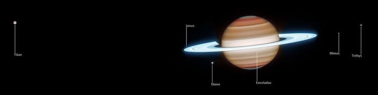Finalmente, en una imagen de campo amplio en el infrarrojo, se distinguen seis de las principales lunas de Saturno: Titán (la más grande de todas), Encélado, Dione, Tetis, Mimas y Jano.