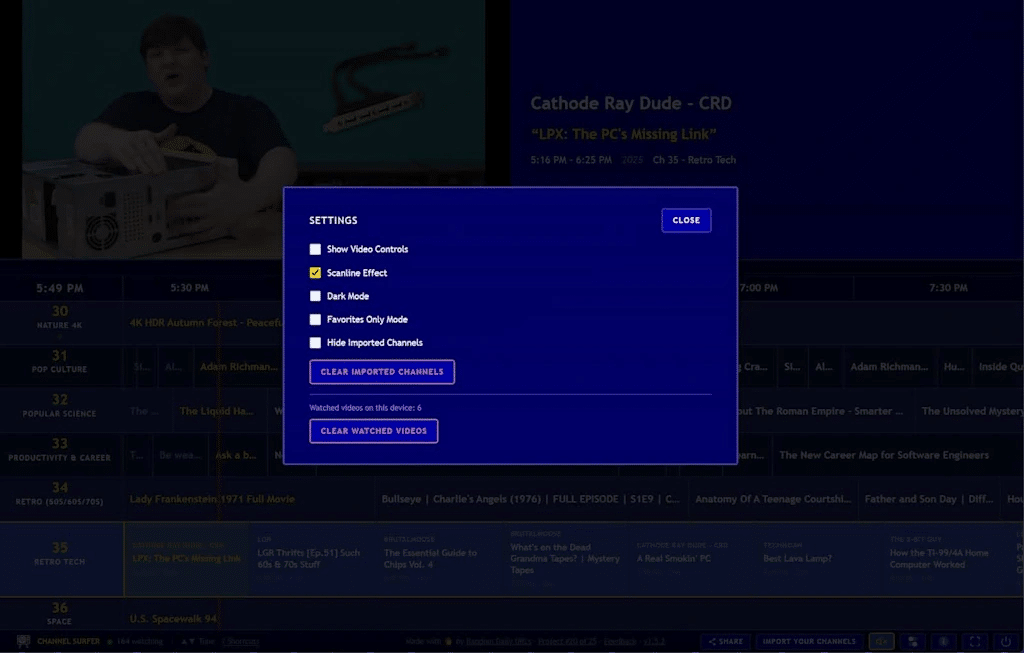 - Pulsa la tecla O o haz clic en el icono de configuración para acceder a algunas opciones adicionales. Puedes mostrar los controles del reproductor de YouTube (por ejemplo, para activar los subtítulos), desactivar el efecto retro de líneas de barrido, activar el modo oscuro u ocultar los canales que hayas importado.